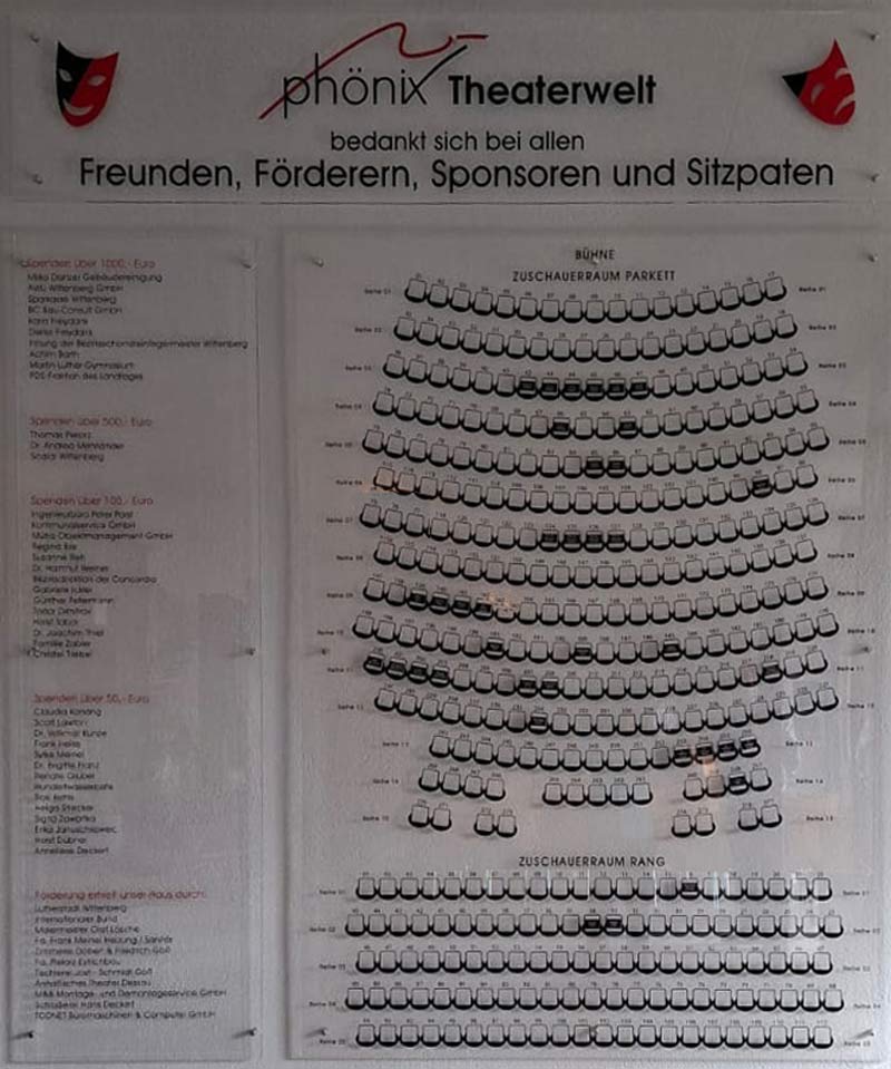Um unser Theater finanziell zu unterstützen, kann man Sitzpatenschaften erwerben. Die Sitzpaten werden auf dem Saalplan genannt. Ziel dieser Aktion ist die Aktualisierung dieser Ehrentafel.